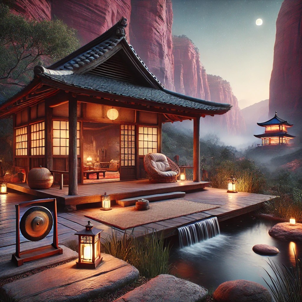 The air shimmers gently, as if infused with the essence of both reality and dreams. The landscape surrounding it is serene but paradoxical—a mixture of rocky temple paths and wild cosmic flora that glow softly at night. The air hums gently, a natural resonance of cosmic energy blending with the canyon’s winds. The energies flow freely, never stagnant, reflecting the path of a true warrior—always learning, always moving, yet always at peace.