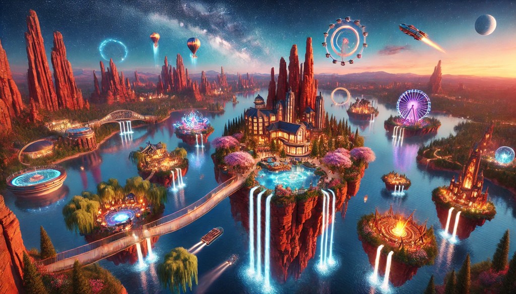 Step through a shimmering portal to be greeted by a panorama that steals your breath away. Azure skies stretch above, while below, the majestic Red Rocks rise in grandeur, cradling deep chasms and serene lakes, including the distant, specially terraformed ocean of Jormungandr. Suspended within this breathtaking expanse are a constellation of floating islands, artfully arranged in an eight-pointed star at varying elevations.