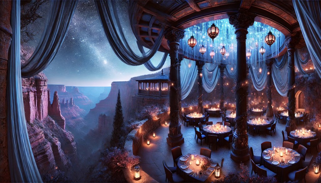 The Demon Shadow Terrace: An outdoor dining area perched on the cliffside, offering panoramic views of the canyon’s red-rock beauty under an everlasting dusk. Darkened pergolas entwined with shadow-vines provide both shade and a sense of secluded elegance. Faint whispers of the canyon winds carry soothing melodies, adding a natural harmony to the experience.