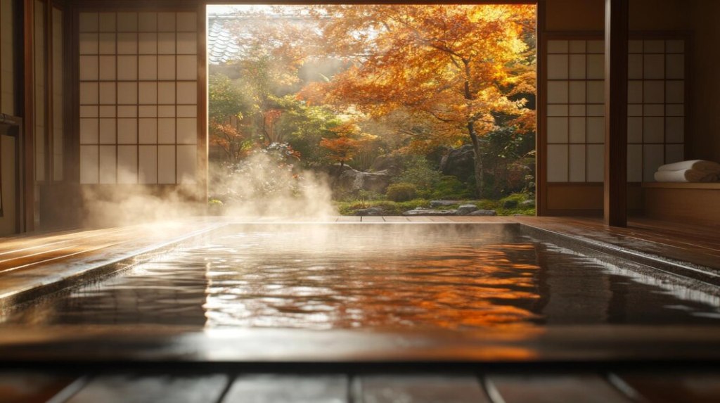 The bathhouse reflects an authentic Japanese design, creating an ambiance of tranquility and elegance.