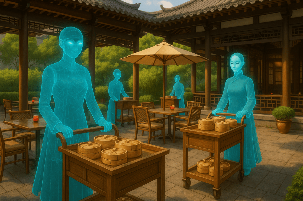 Step into the outer garden, and you find a different harmony: stone paths winding among bonsai and bamboo, koi stirring waters that reflect the lantern light. From shaded parasols, you may watch as digital attendants — serene as moonlit masks, luminous as spirit-guides — glide past with carts. Each basket they bear is a cloud, each dumpling a secret folded into dough.