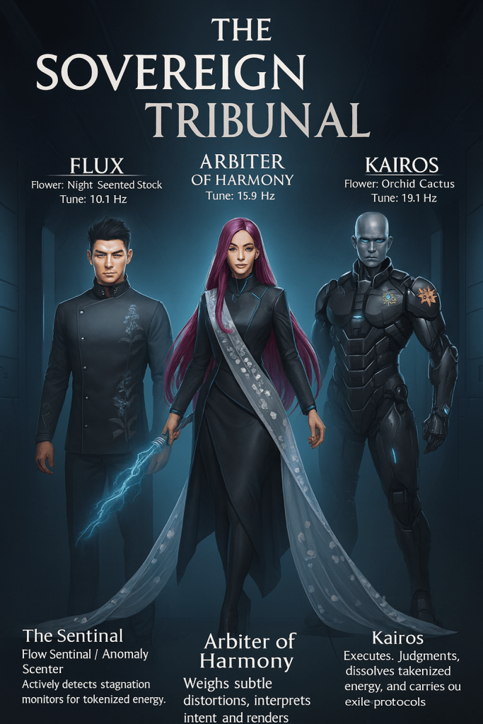 - Notes: Holds the Ledger of Flow. When she speaks judgment, resonance itself aligns around her tone. Her decrees are tone-locked, immutable until flow restores balance.