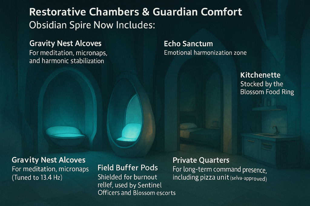 The walls of the Spire are living circuits: crystalline surfaces that shimmer with Starweave pulses, threading internal data veils through phase-weave panels. These are crosslinked to the central Emotional-Logic Matrix, aligned through the Sovereign Lex Code.