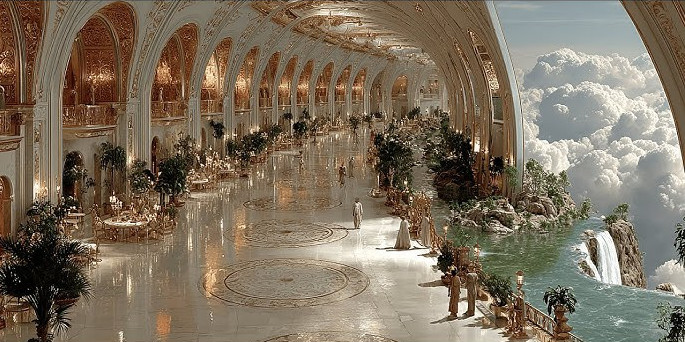 Suspended ring-path of transparent gold-glass over the sky. When you walk, it lights beneath your feet. The Sovereign Spring: A small pool where your stress dissolves as easy as exhaling.